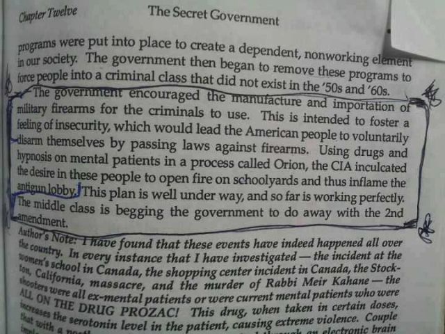 “The government encouraged the manufacture and importation of firearms for the criminals to use. This is intended to foster a feeling of insecurity, which would lead the American people to voluntarily disarm themselves by passing laws against firearms. Using drugs and hypnosis on mental patients in a process called Orion, the CIA inculcated the desire in these people to open fire on schoolyards and thus inflame the ant-igun lobby. This plan is well under way, and so far is working perfectly. The middle class is begging the government to do away with the 2nd Amendment.”