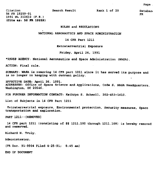 Registered under (Title 14, Section 1211 of the Code of Federal Regulations). Anyone found guilty of such contact could face up to one year imprisonment as well as a fine of $5000. Also, any individual who had been "exposed" to an extraterrestrial could be quarantined under armed guard by the NASA administrator without a hearing. The law was passed originally to protect Earth from possible biological contamination when being in contact with aliens(extraterrestrials).It has been suggested by researchers and scientists that the U.S. government was very concerned that contact with extra-terrestrial bacteria could result in a worldwide plague. The immune system of human beings wouldn't be able to fight off extra-terrestrial bacteria. But I thought there was no such thing as extraterrestrials a.k.a Fallen Angels?