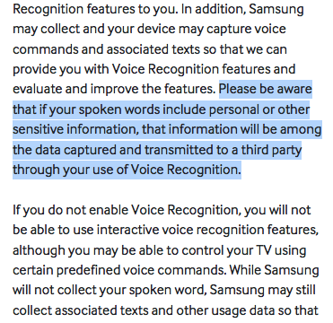 To provide you the Voice Recognition feature, some voice commands may be transmitted (along with information about your device, including device identifiers) to a third-party service that converts speech to text or to the extent necessary to provide the Voice Recognition features to you. In addition, Samsung may collect and your device may capture voice commands and associated texts so that we can provide you with Voice Recognition features and evaluate and improve the features. Please be aware that if your spoken words include personal or other sensitive information, that information will be among the data captured and transmitted to a third party through your use of Voice Recognition.Obviously, some very temporary "collection" and "transmission" needs to take place to allow a third party service to "recognize" the user's voice and ensure the smart TV does what it's told. But Samsung also collects and captures these communications... and it doesn't really say how, where or for how long these are stored.
